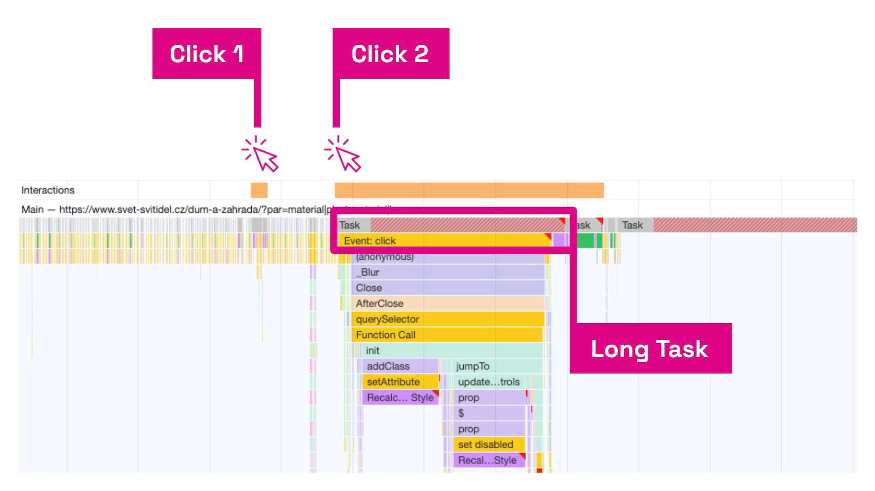 - Reakce prohlížeč na druhou interakci („Click 2“) bude mít zpoždění, protože se uživatel trefil do zpracování javascriptového kódu na pozadí („Long Task“).
