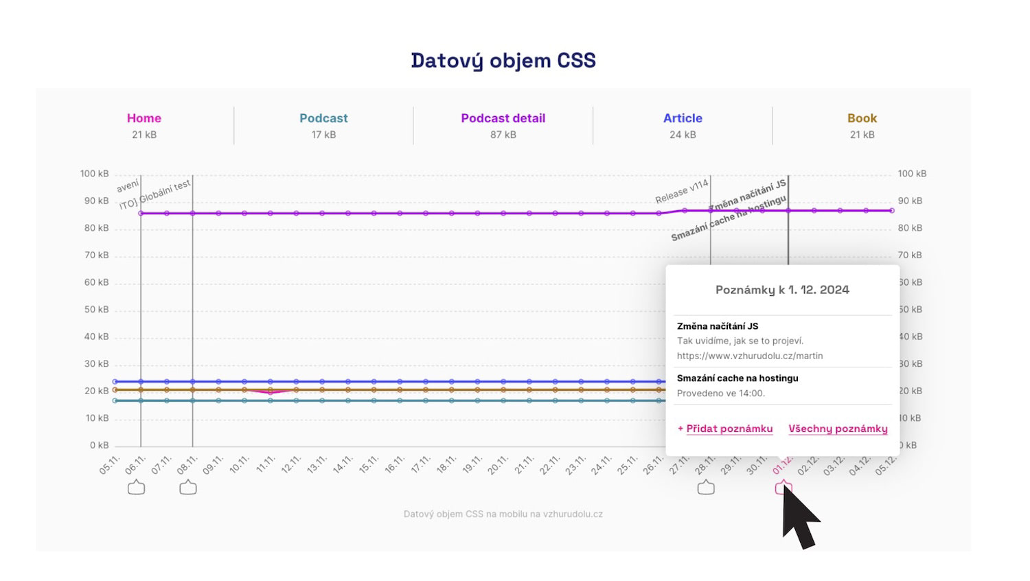 Poznámky v grafech našeho monitoringu rychlosti vám umožní zaznamenat tyto důležité okamžiky, aby se vám pak lépe dohledávaly příčiny případných zlepšení nebo zhoršení metrik.