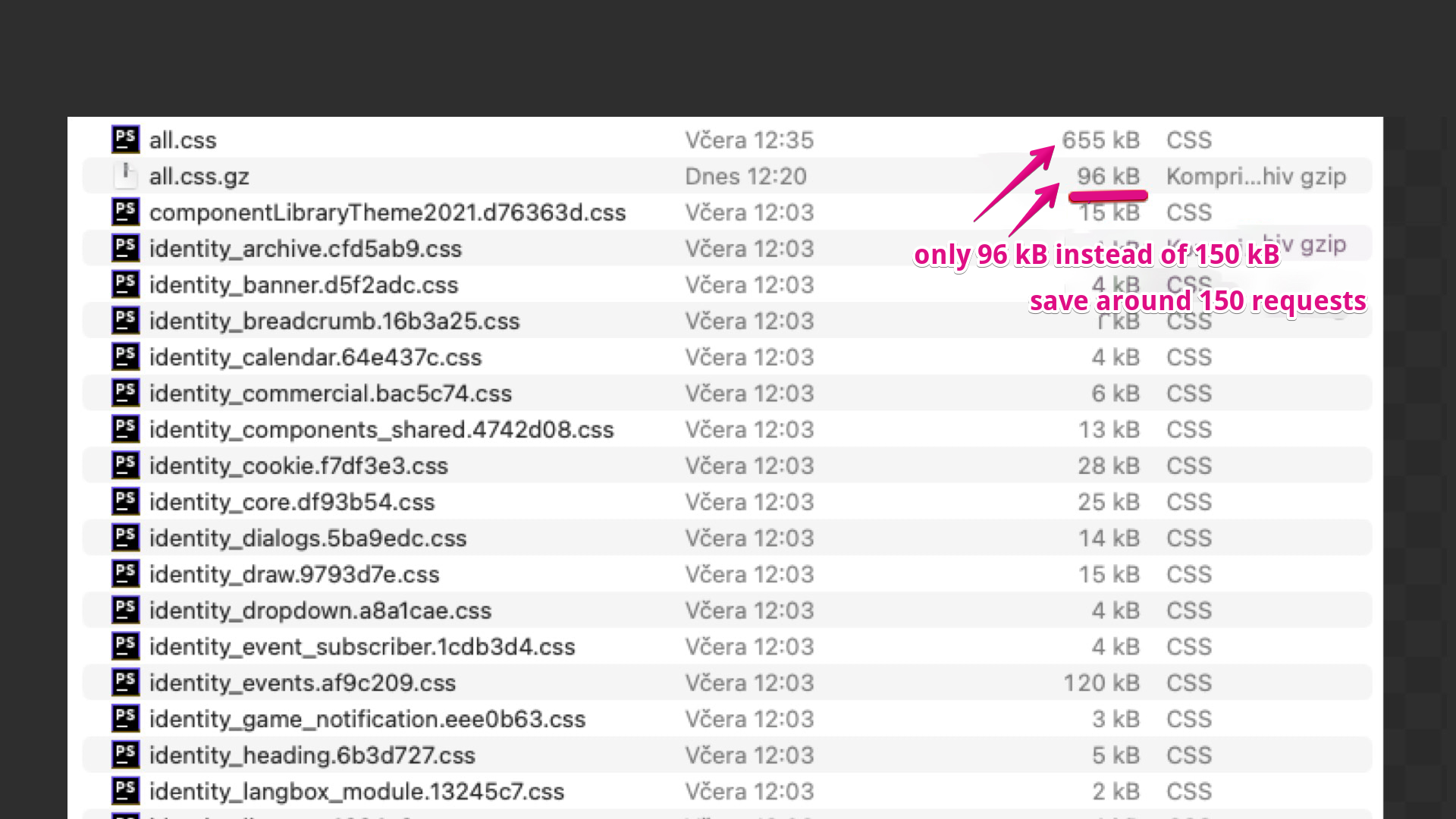 Minifikací se snížil objem dat na 655 kB, po použití Gzip komprese jsme se dostali na 96kB přenesených dat. Ušetřili jsme 54 requestů při stahování CSS souborů a zhruba ⅓ datového objemu, který je přenášen.